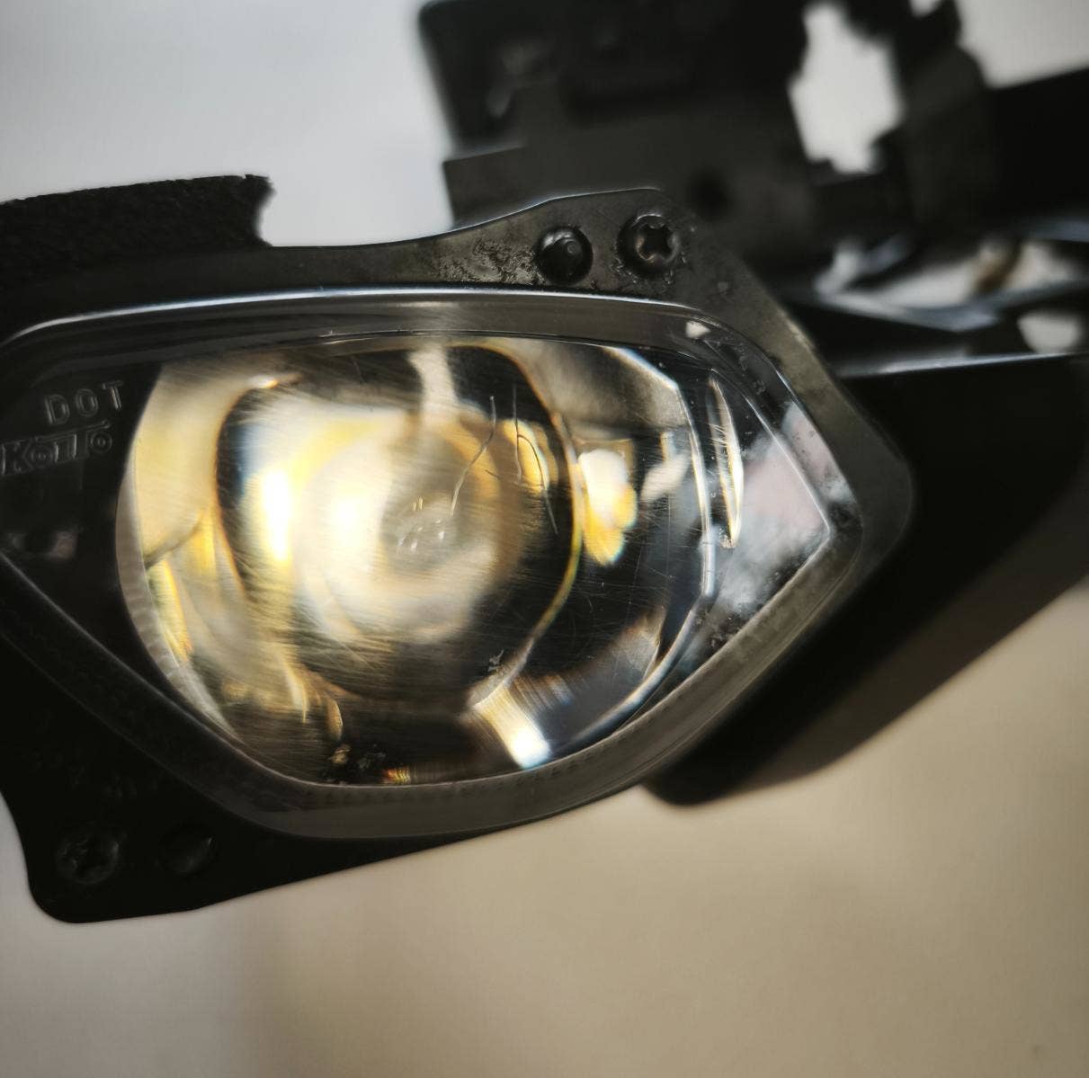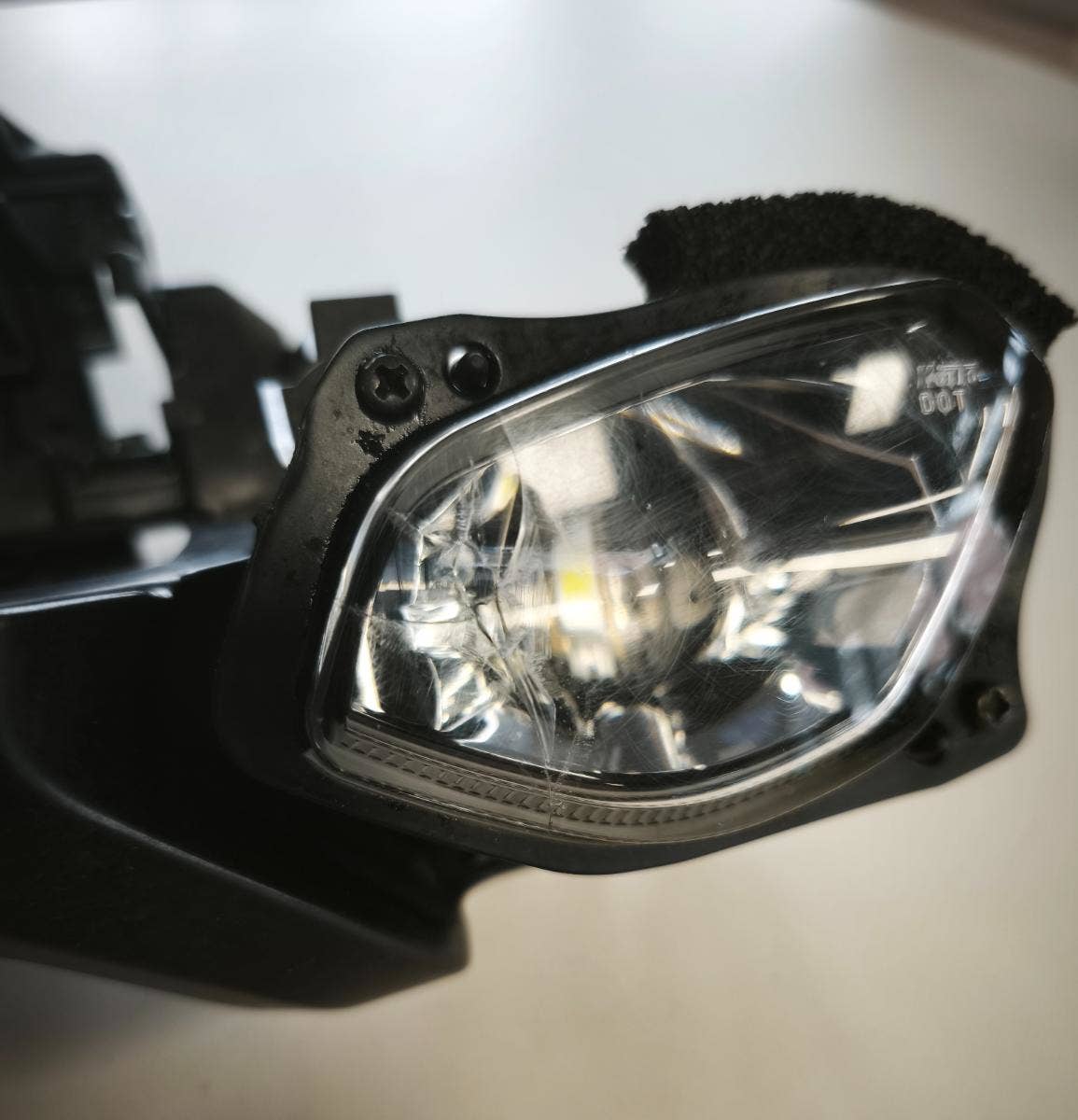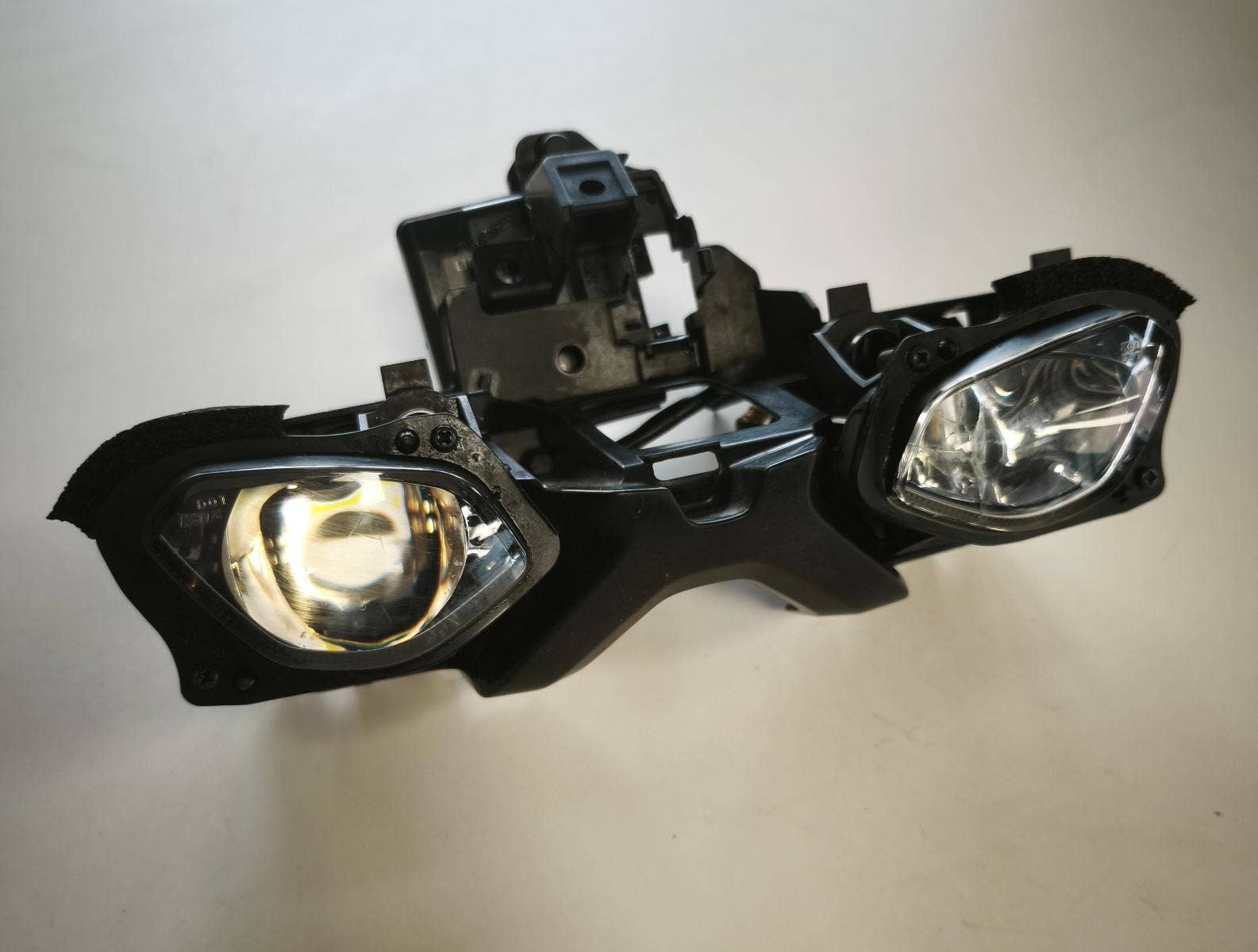 Přední reflektor MT-10 22-24. Reflektor má prasklou levou čočku a drobné praskliny na pravé čočce. Rámeček, jednotka reflektoru a zbytek je v pořádku.